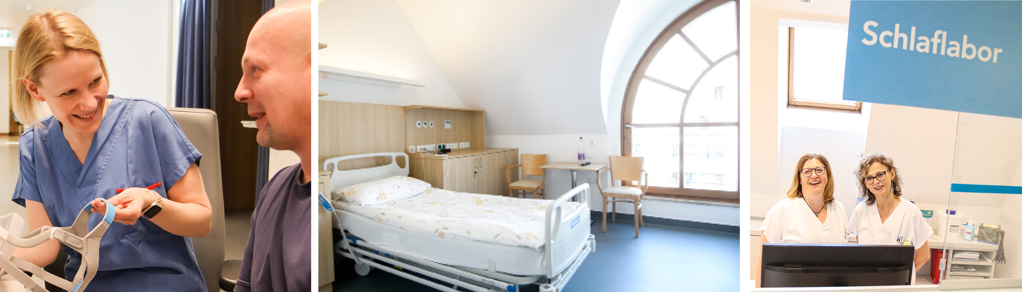 Die polysomnografische Überwachung erfordert angenehme Umgebungsbedingungen in einem Einzelzimmer. Wir unterscheiden Diagnose- von Therapienächten bzw. Kontrollnächten jeweils über eine einzige Nacht, wobei die Patient*innen üblicherweise am Abend um ca. 19.00 Uhr erscheinen, und am Morgen ab 6.00 Uhr wieder das Haus verlassen können. Die Besprechungen finden dann kurze Zeit später nach Auswertung der aufgezeichneten nächtlichen Signale statt.